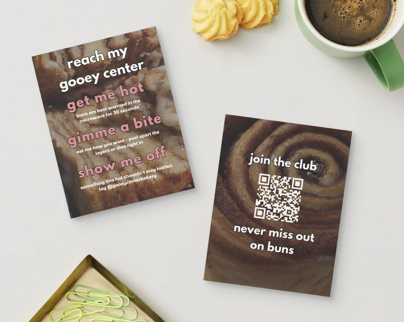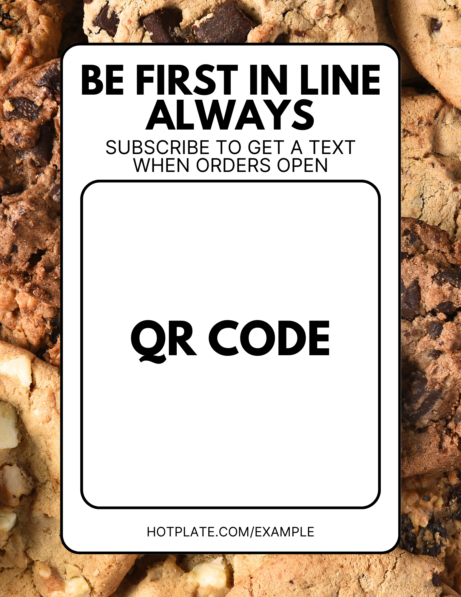 Using a QR code on flyers, cards, and labels is a great way to get customers to quickly take some sort of action. You should include a QR code that links to your Hotplate storefront or SMS subscription form on any handout or sticker you make.