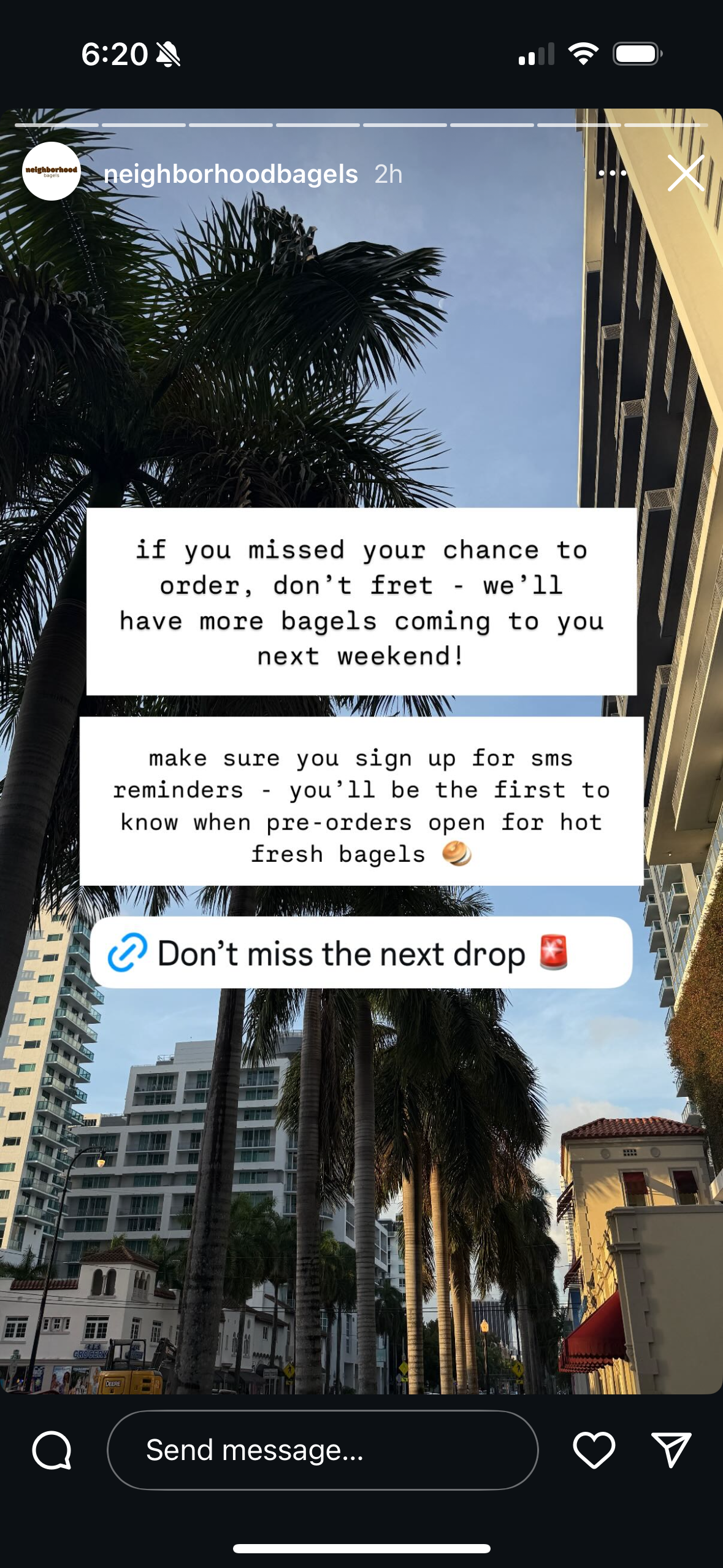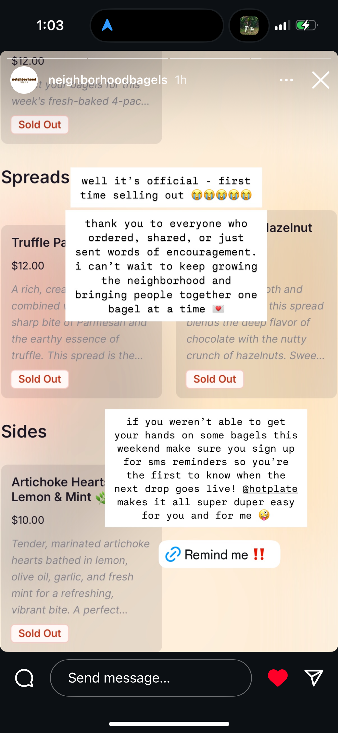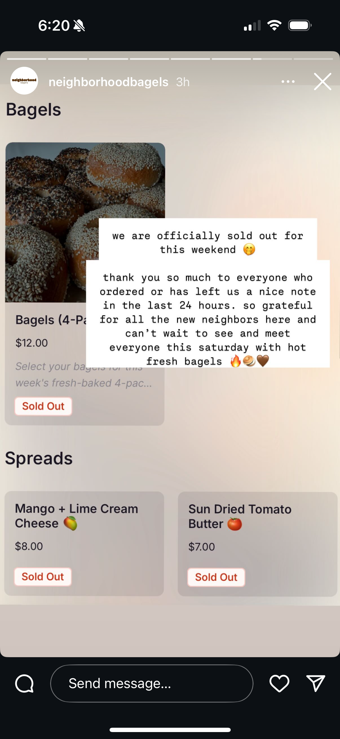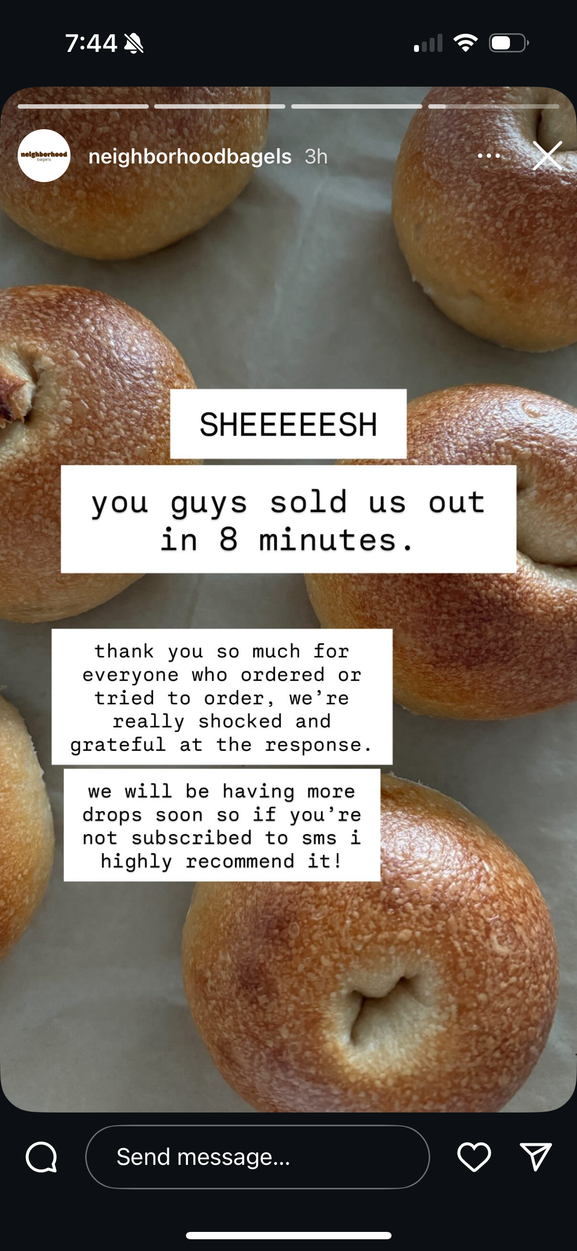 Neighborhood Bagels started as a small bagel pop up out of a home kitchen in Miami. They started with extremely low inventory which consistently sold out and announced each sell out on social media. Over 6 months, they’ve developed a reputation as one of “Miami’s Best Bagels”, grown their SMS subscriber list by hundreds, and are able to sell out bigger and bigger inventories. Here are some examples of stories they posted along that journey: